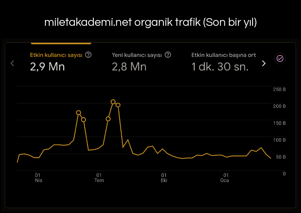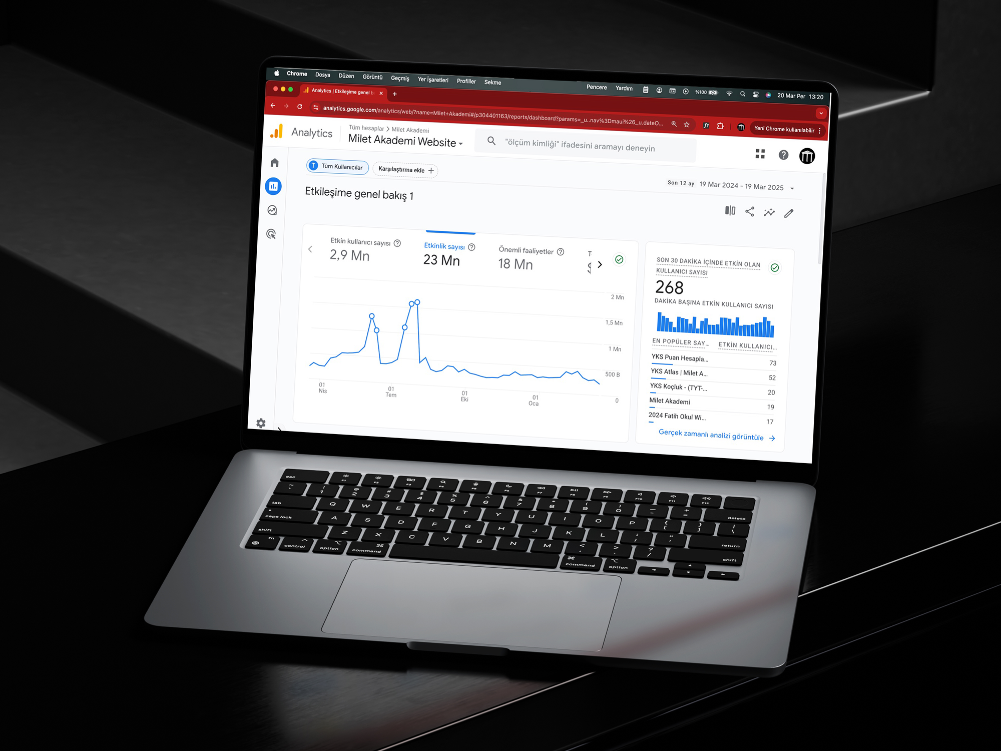 Web sitesi tasarımı sonrası yürüttüğümüz SEO çalışmalarıyla, Milet Akademi’nin dijitaldeki görünürlüğünü kısa sürede üst seviyeye taşıdık. Elde edilen etkileşim verileri, stratejik içerik üretiminin ve teknik altyapının başarısını yansıtıyor.
